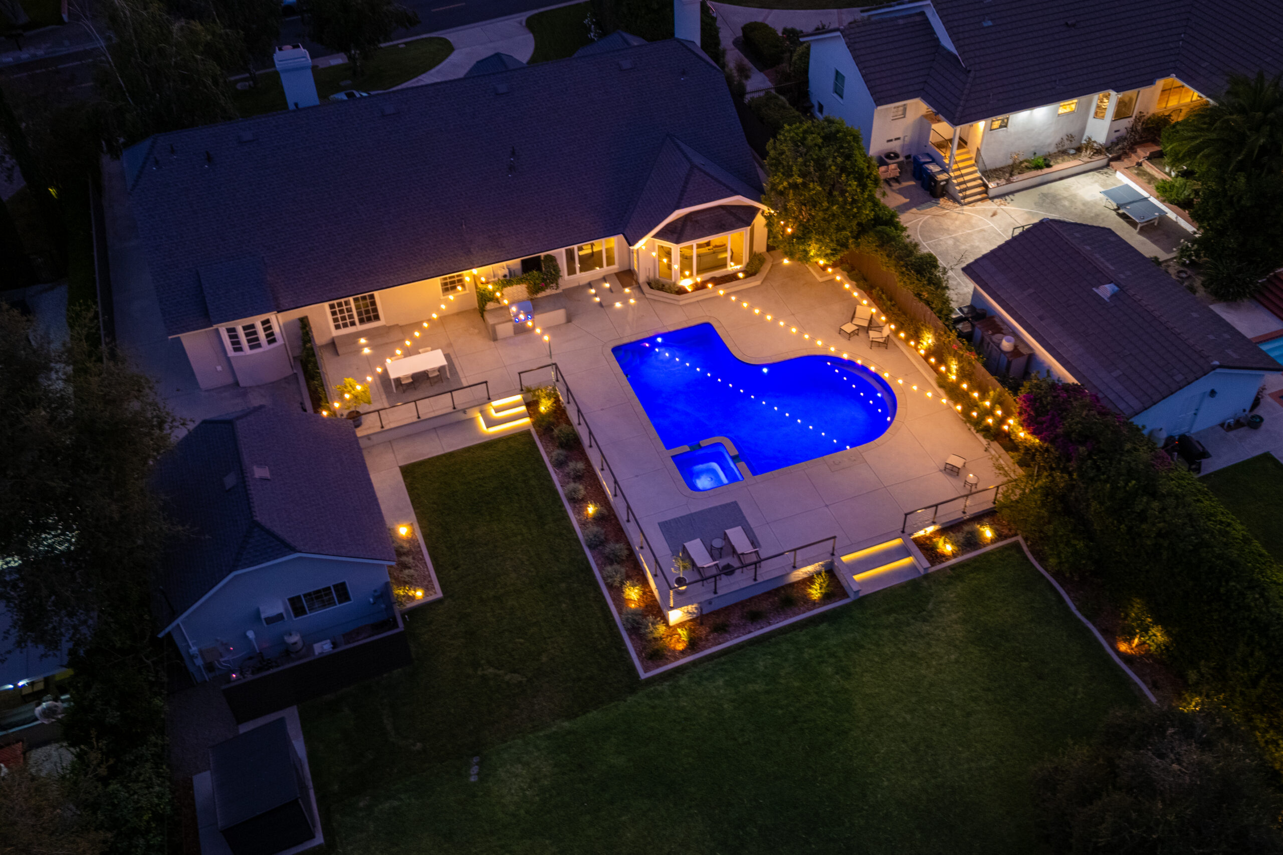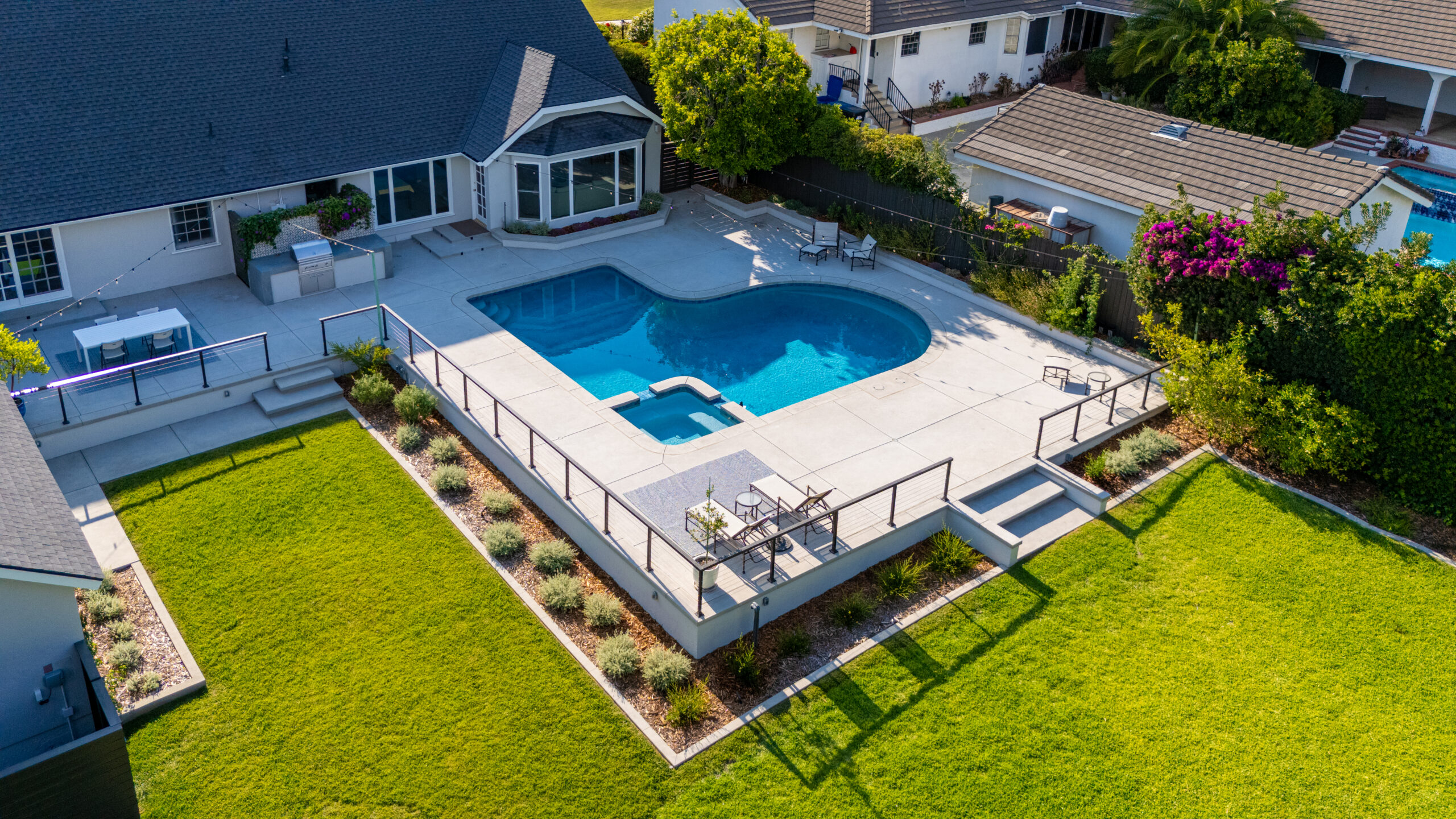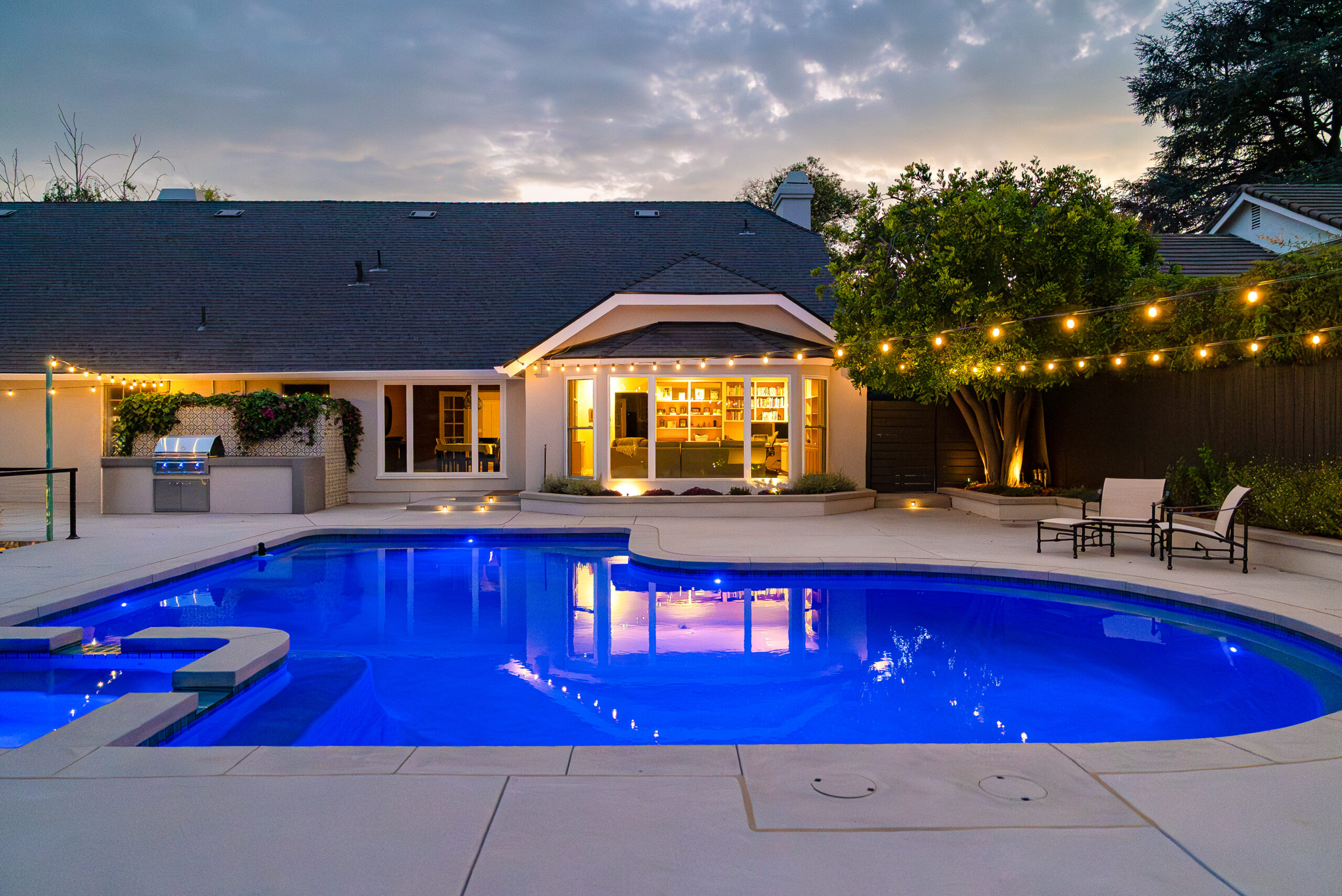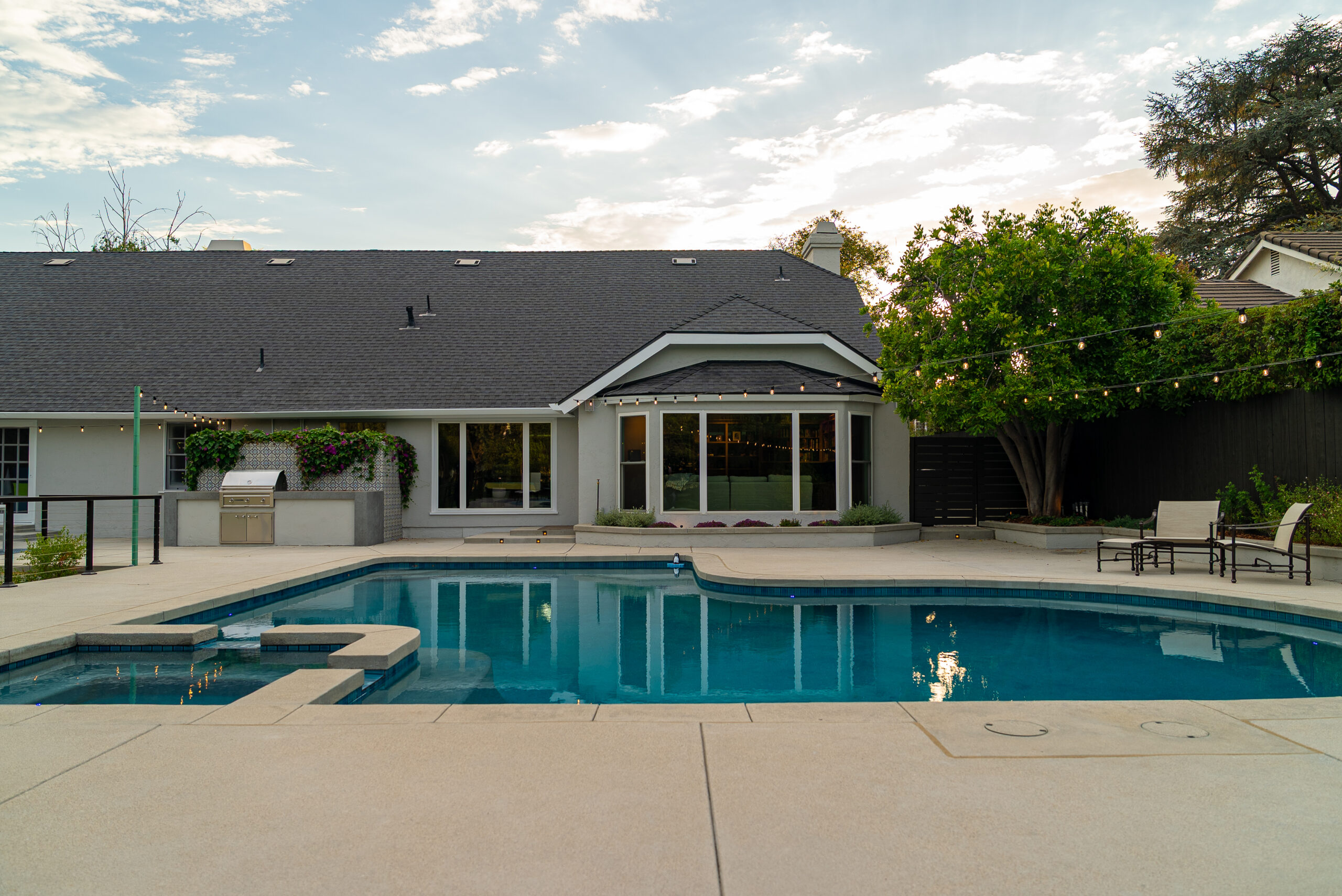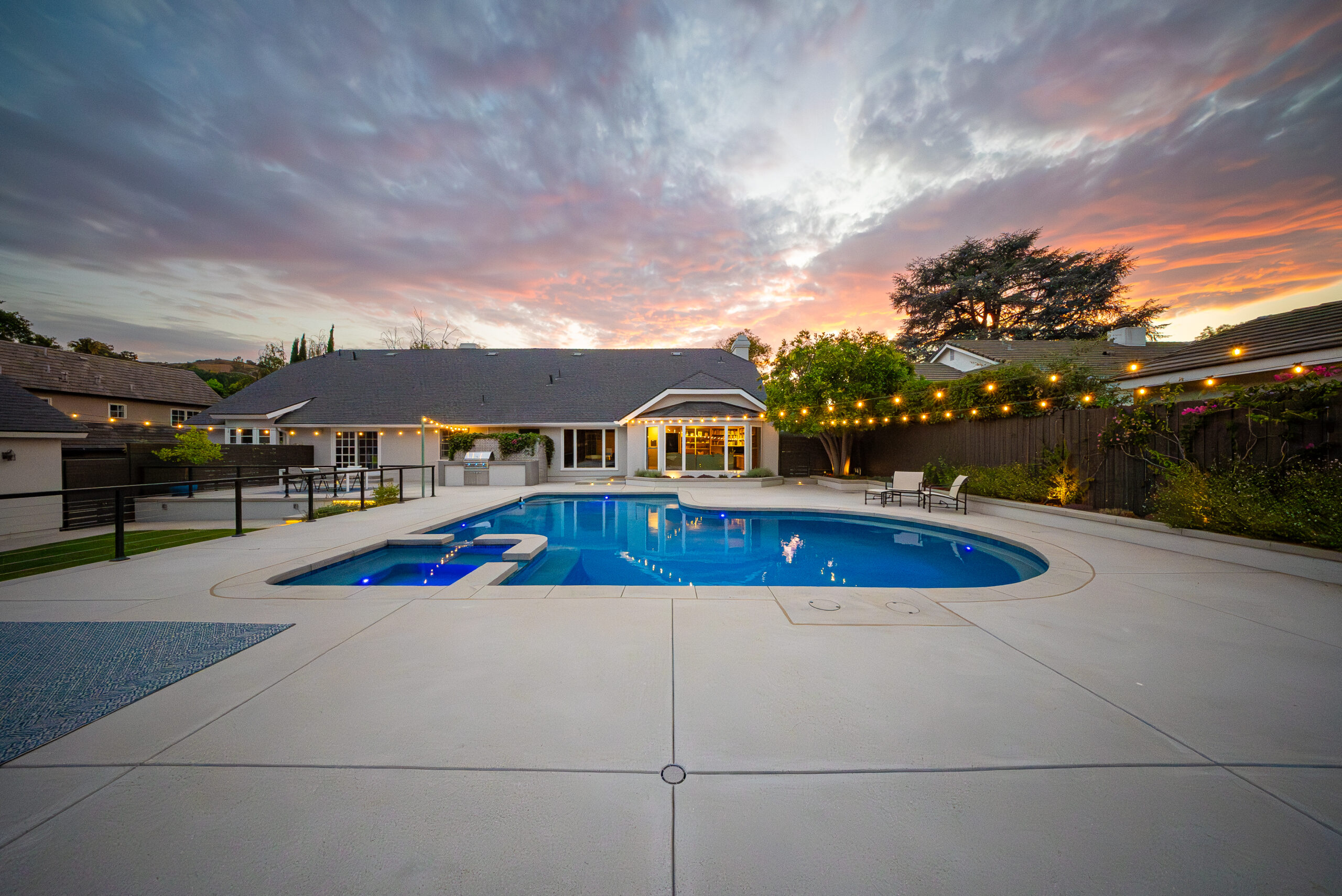 A modern pool remodel sets the stage for this backyard upgrade, complemented by a custom outdoor BBQ featuring a Dekton Kreta surface for a sleek, architectural finish. Sand-finished concrete adds texture and cohesion throughout the space, while layered outdoor lighting highlights key design elements and enhances the overall atmosphere. The result is a refined outdoor environment built for durability, comfort, and visual impact.
