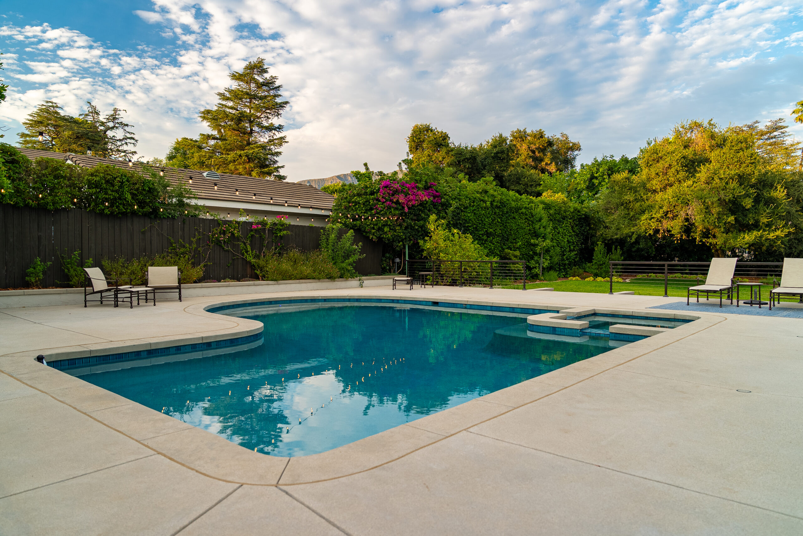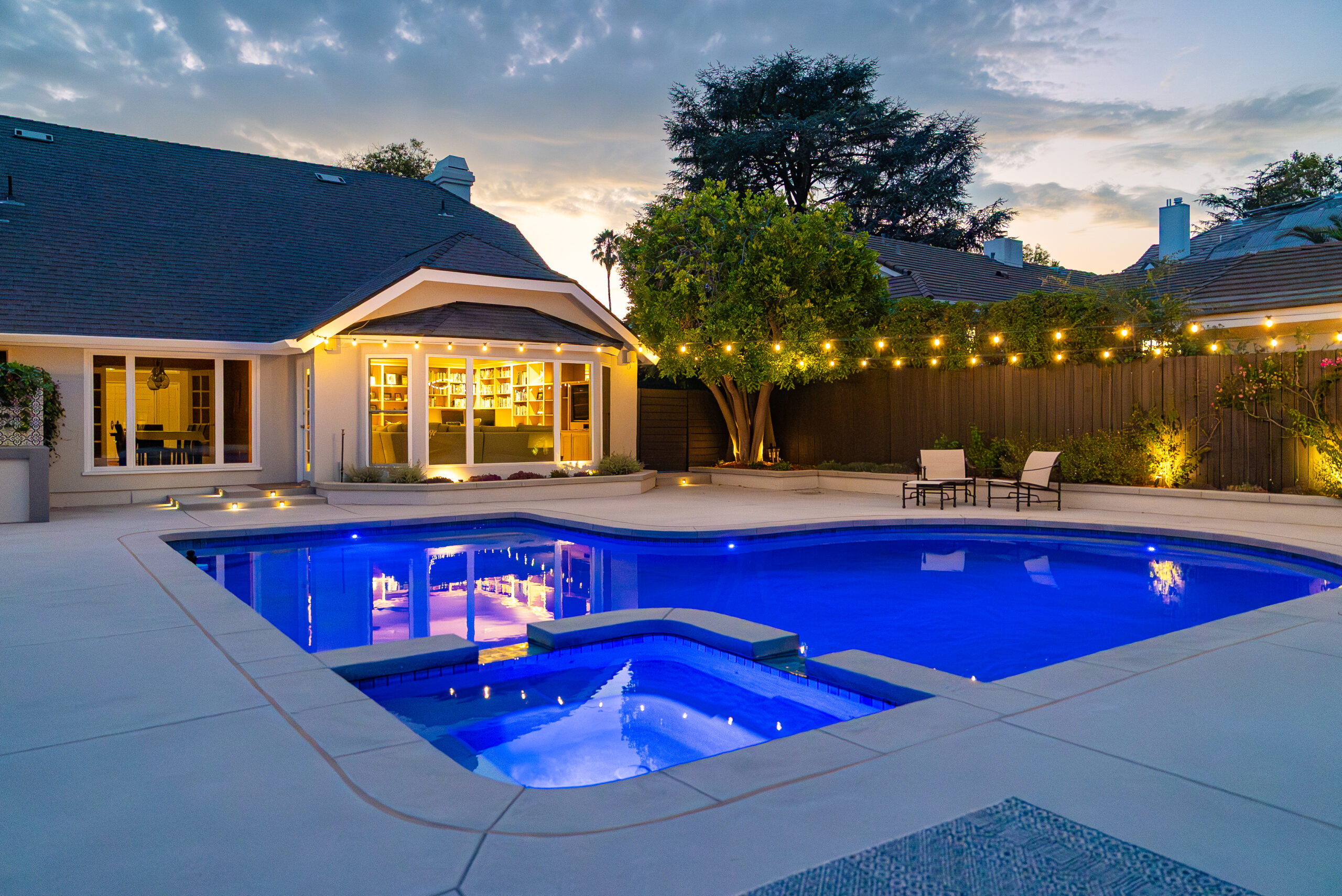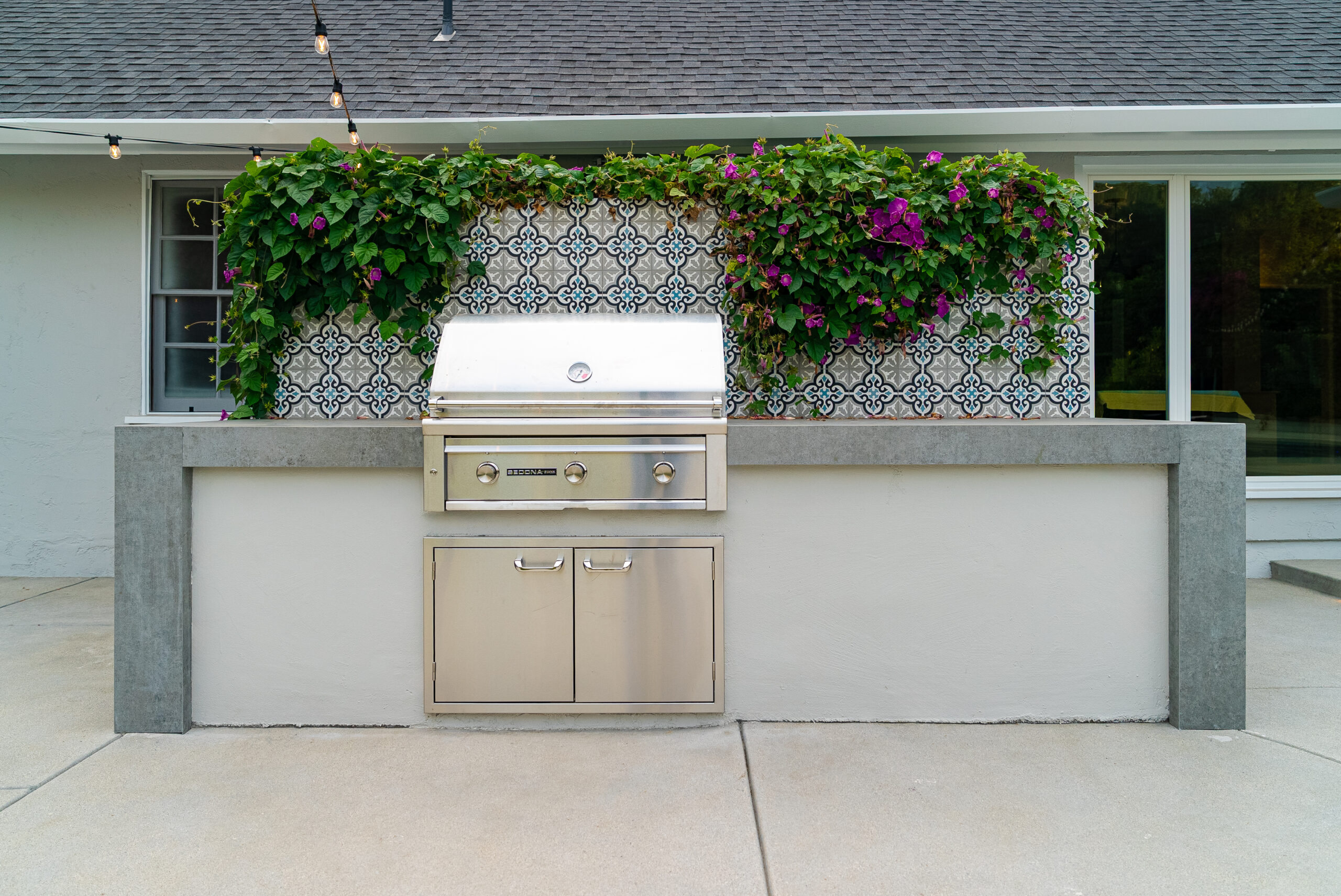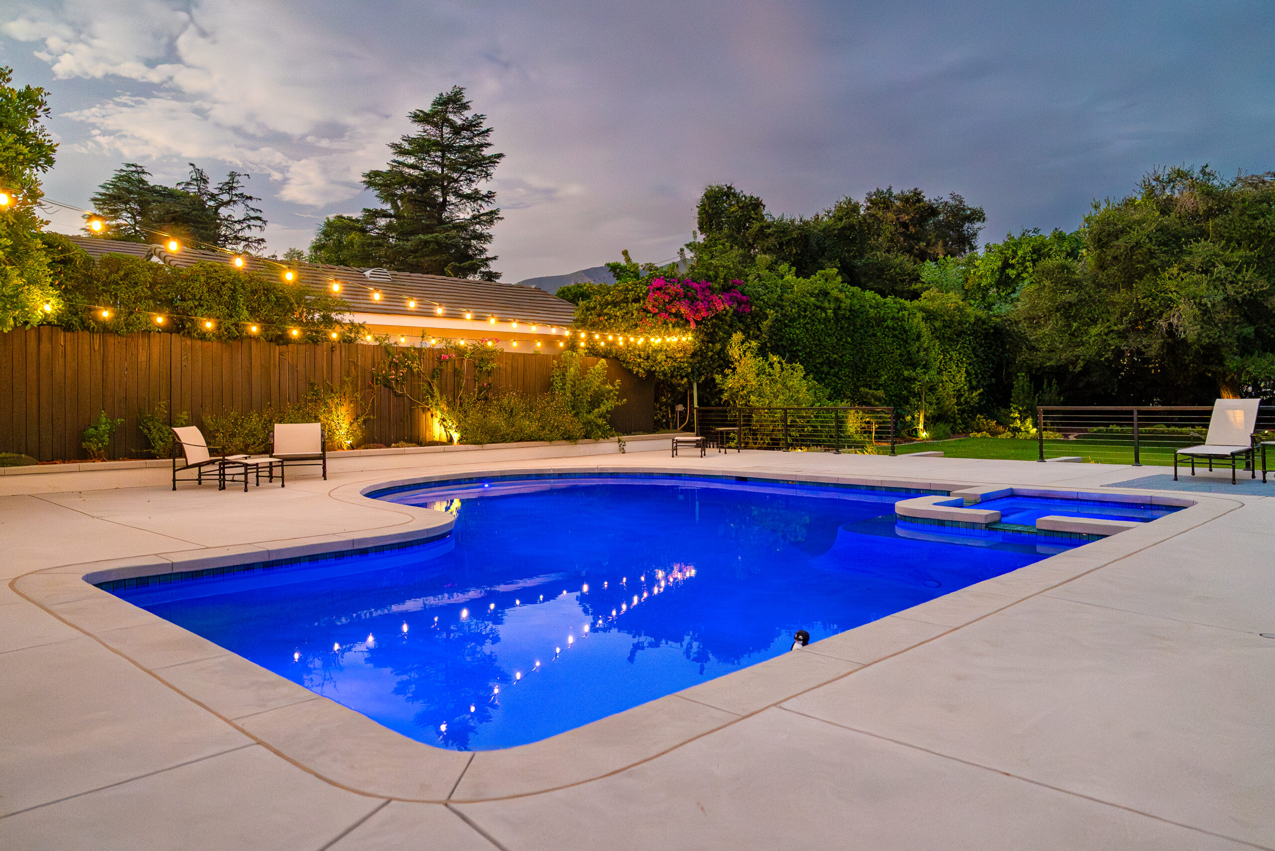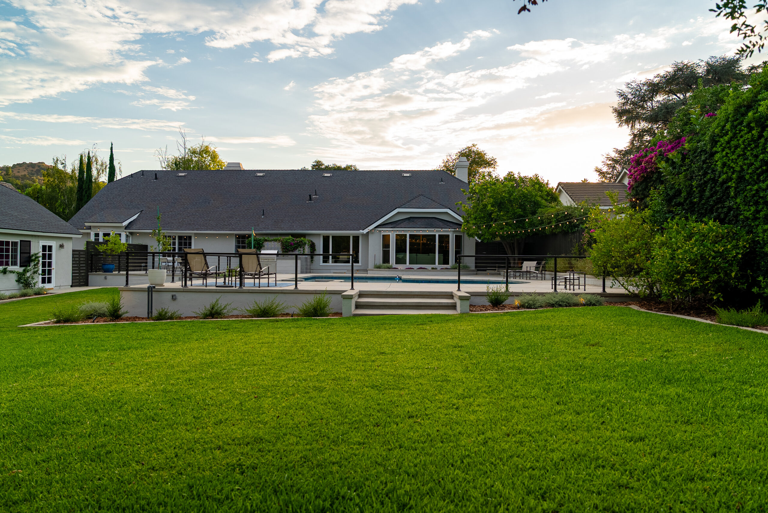 A modern pool remodel sets the stage for this backyard upgrade, complemented by a custom outdoor BBQ featuring a Dekton Kreta surface for a sleek, architectural finish. Sand-finished concrete adds texture and cohesion throughout the space, while layered outdoor lighting highlights key design elements and enhances the overall atmosphere. The result is a refined outdoor environment built for durability, comfort, and visual impact.