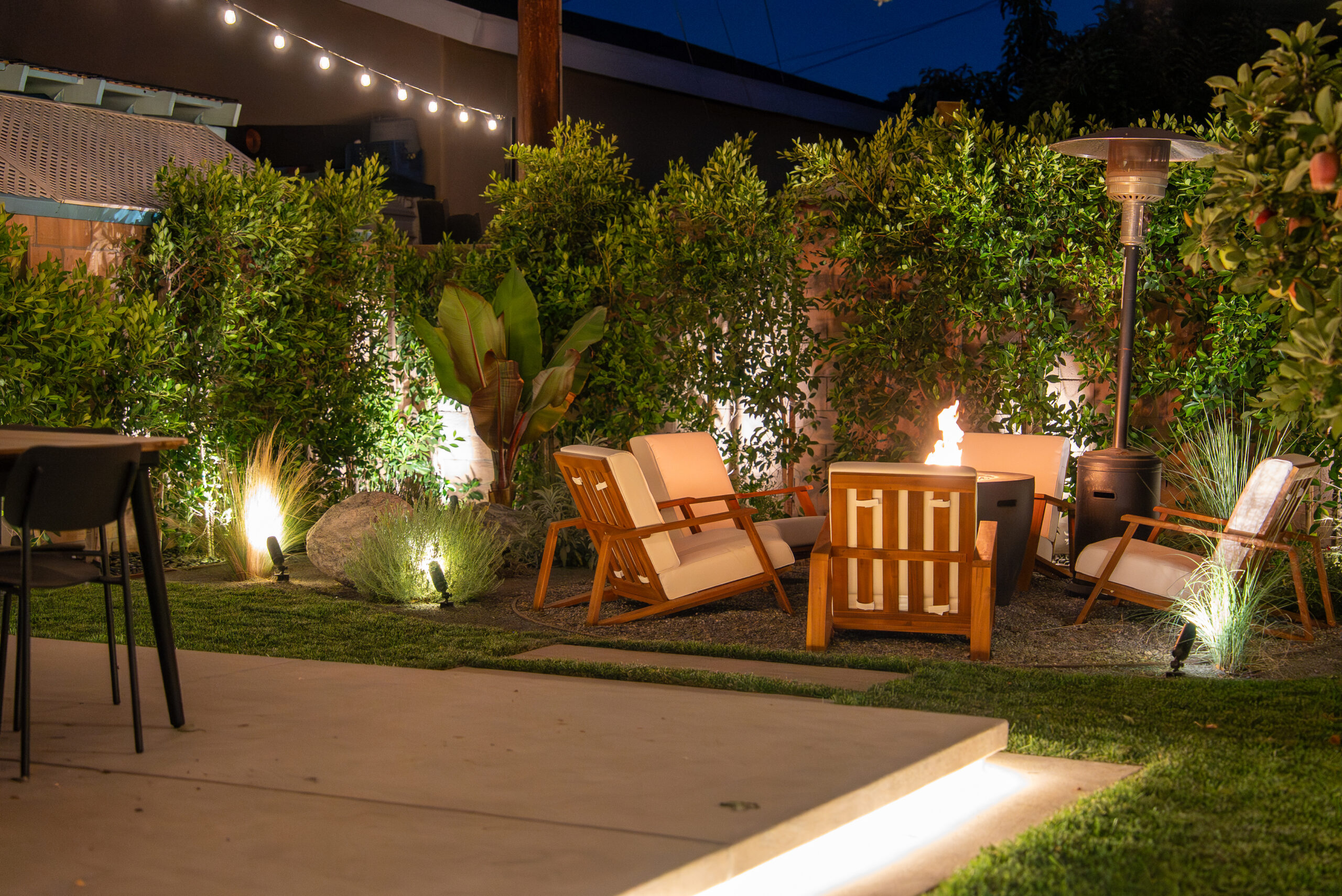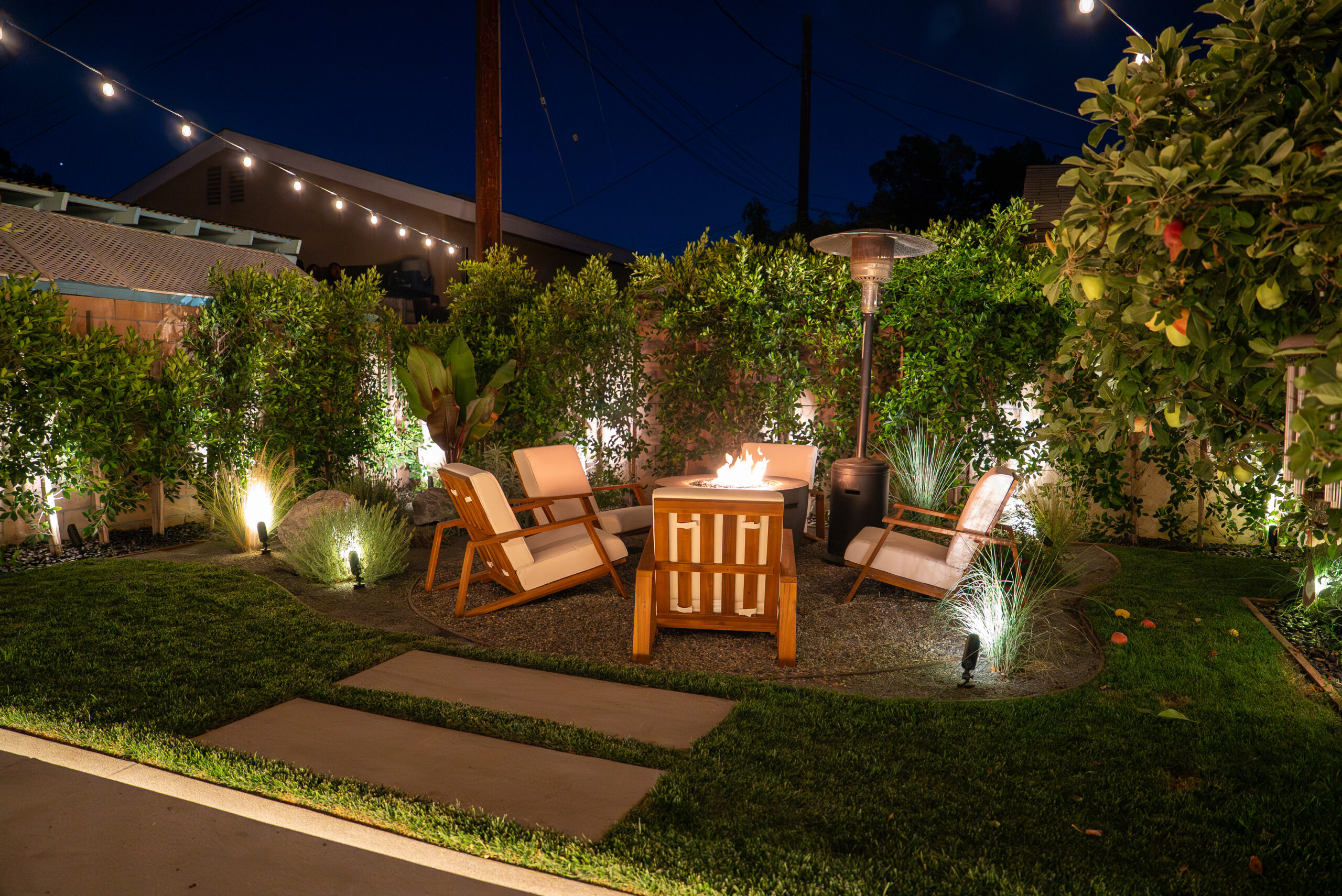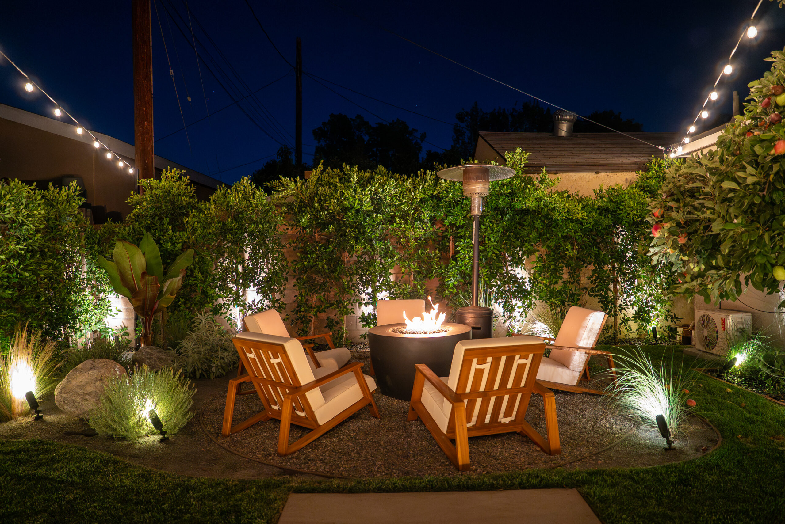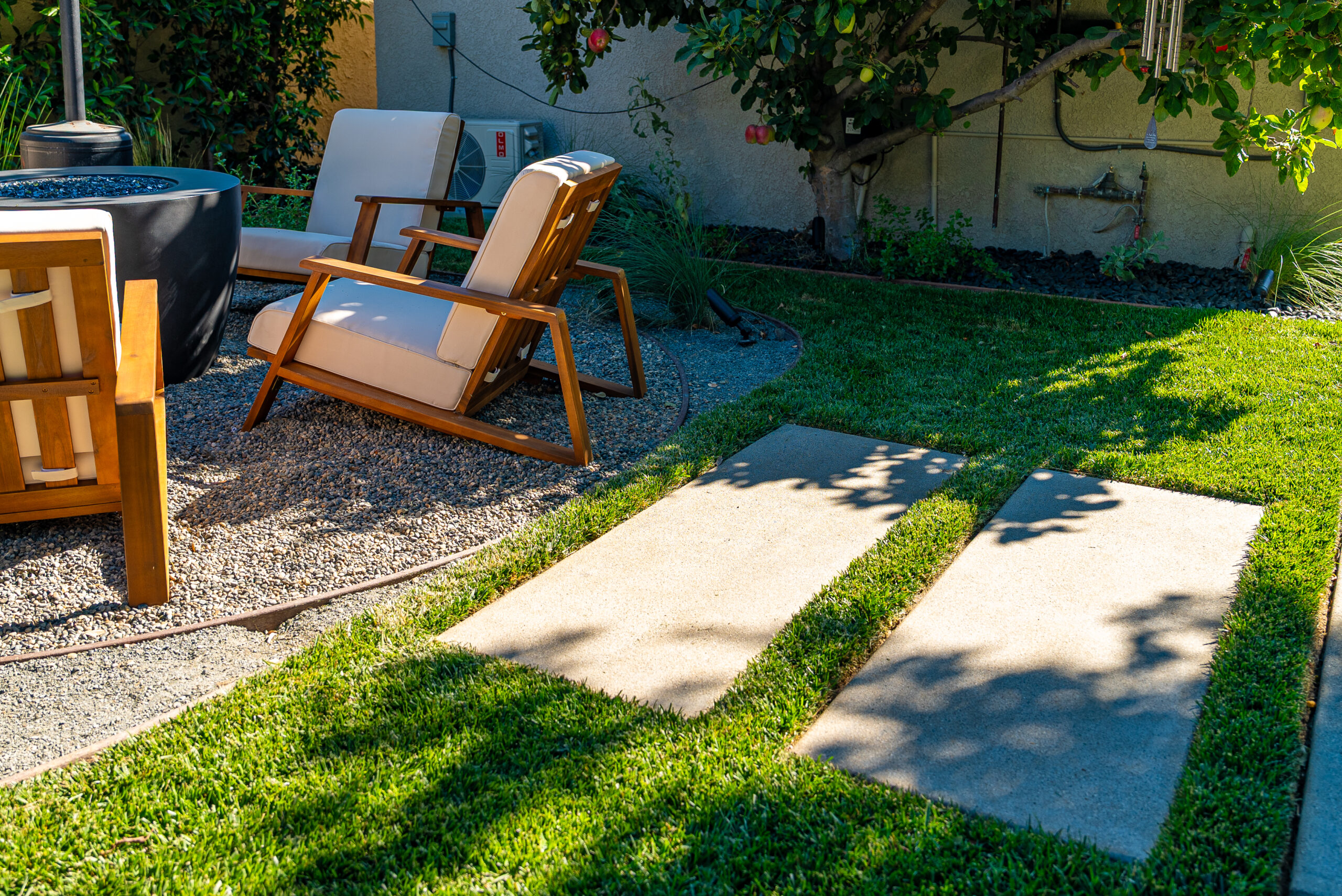 Designed for everyday use and entertaining, this backyard upgrade combines durable concrete features with warm, natural elements. Concrete steps and a spacious patio provide structure and flow, while new sod and surrounding landscaping add balance and comfort. The fire pit area serves as a focal point for gatherings, enhanced by outdoor lighting that creates ambiance and visibility after sunset.