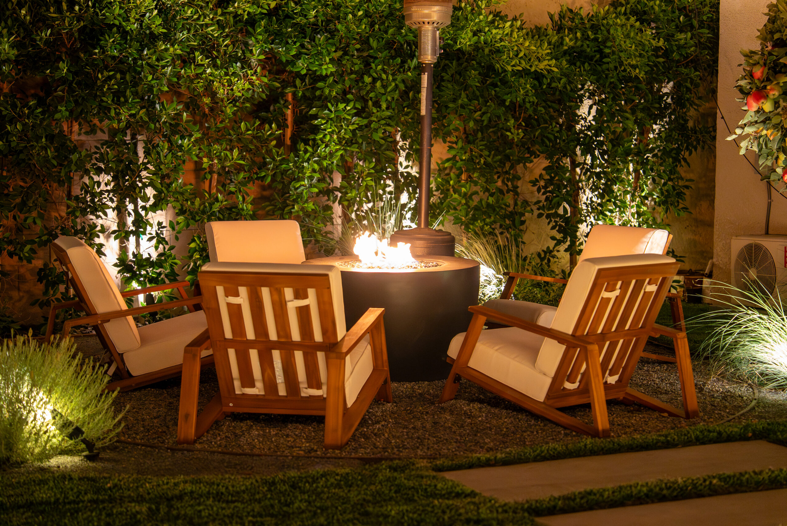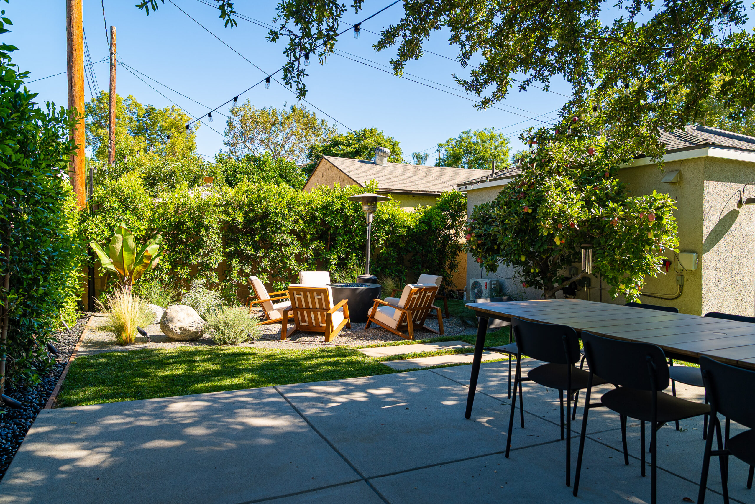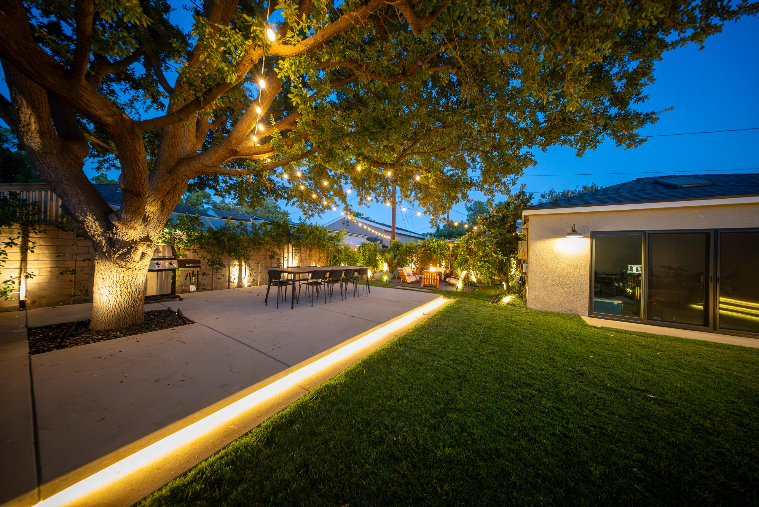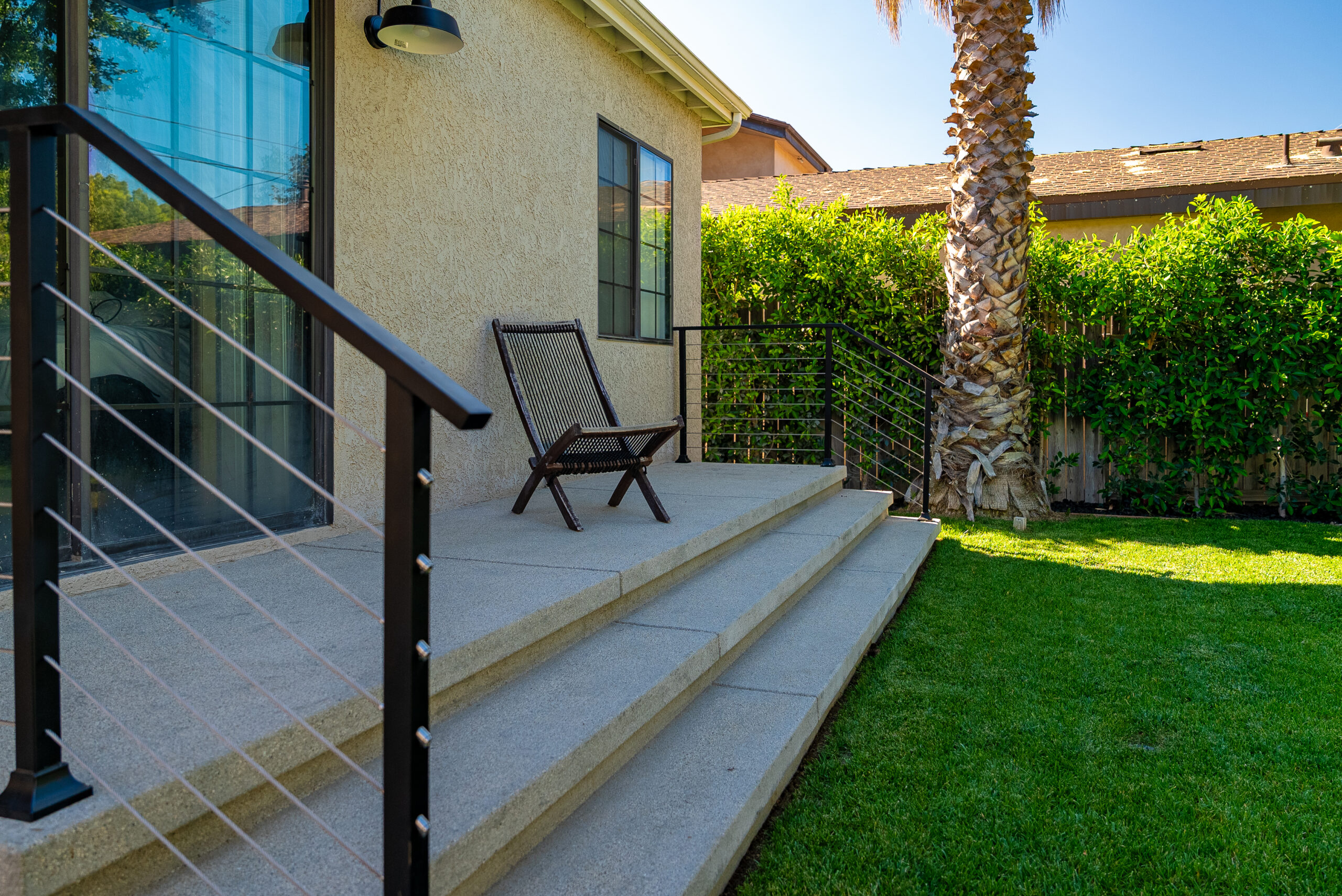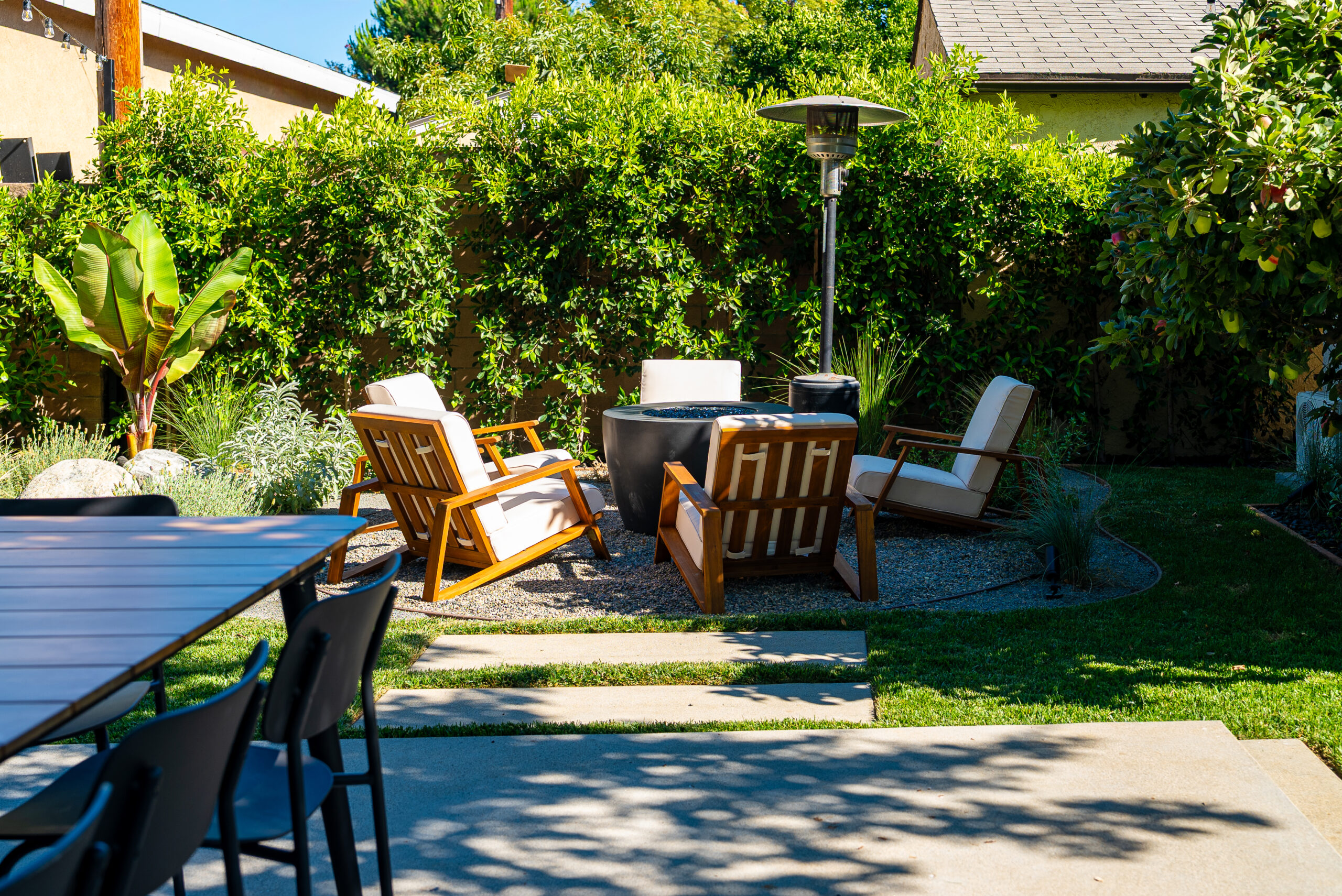 Designed for everyday use and entertaining, this backyard upgrade combines durable concrete features with warm, natural elements. Concrete steps and a spacious patio provide structure and flow, while new sod and surrounding landscaping add balance and comfort. The fire pit area serves as a focal point for gatherings, enhanced by outdoor lighting that creates ambiance and visibility after sunset.