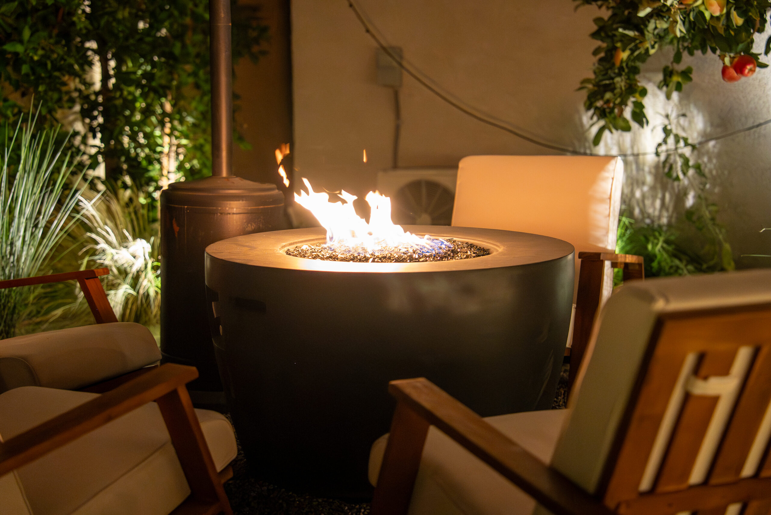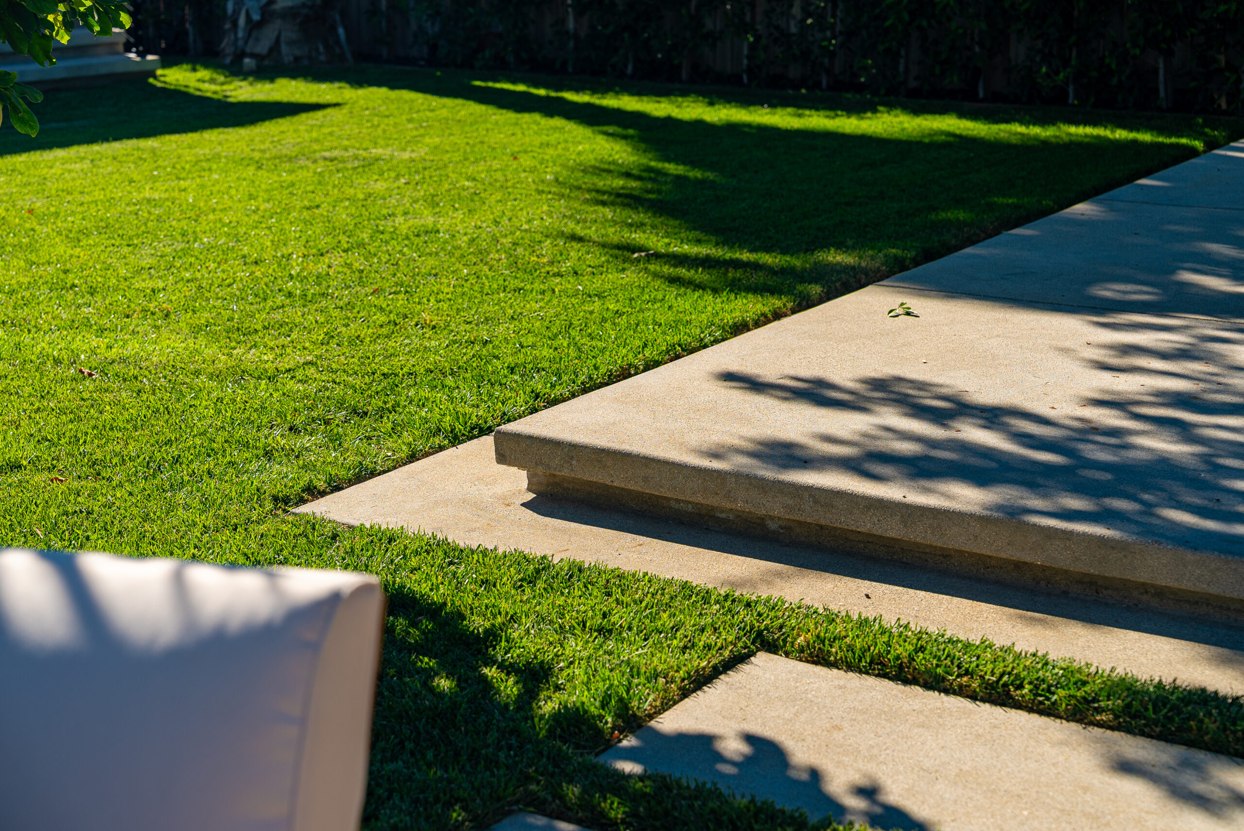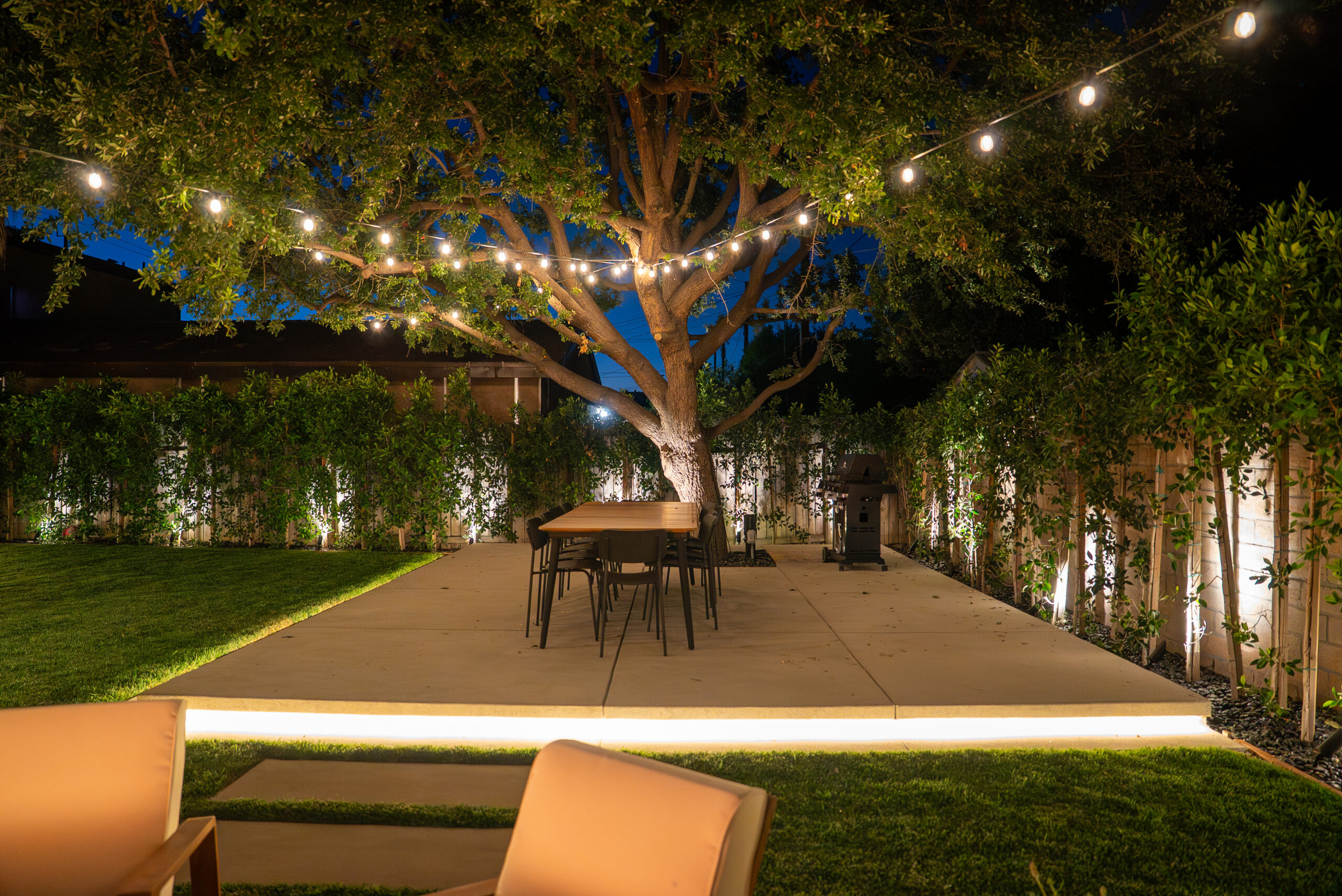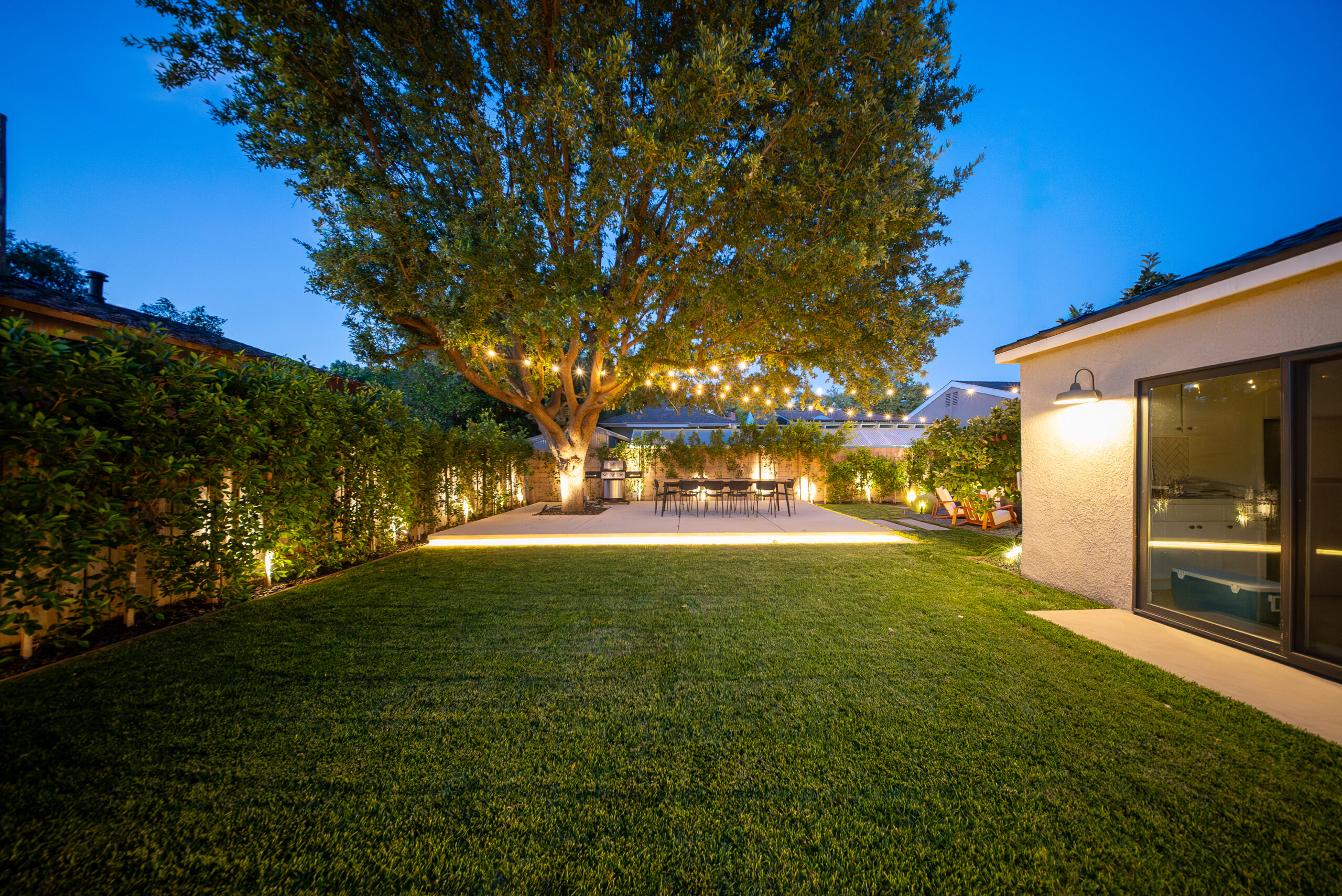 Designed for everyday use and entertaining, this backyard upgrade combines durable concrete features with warm, natural elements. Concrete steps and a spacious patio provide structure and flow, while new sod and surrounding landscaping add balance and comfort. The fire pit area serves as a focal point for gatherings, enhanced by outdoor lighting that creates ambiance and visibility after sunset.