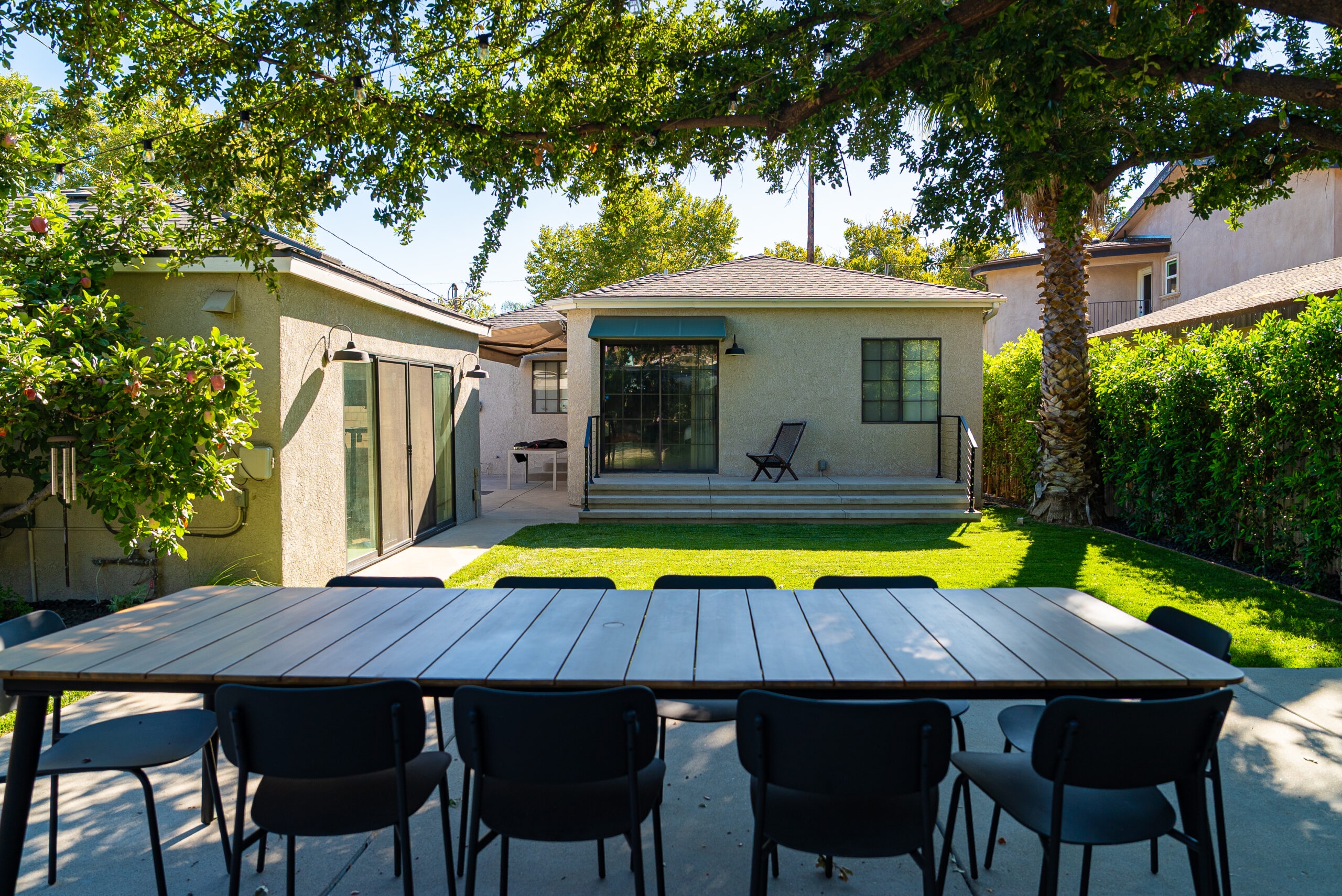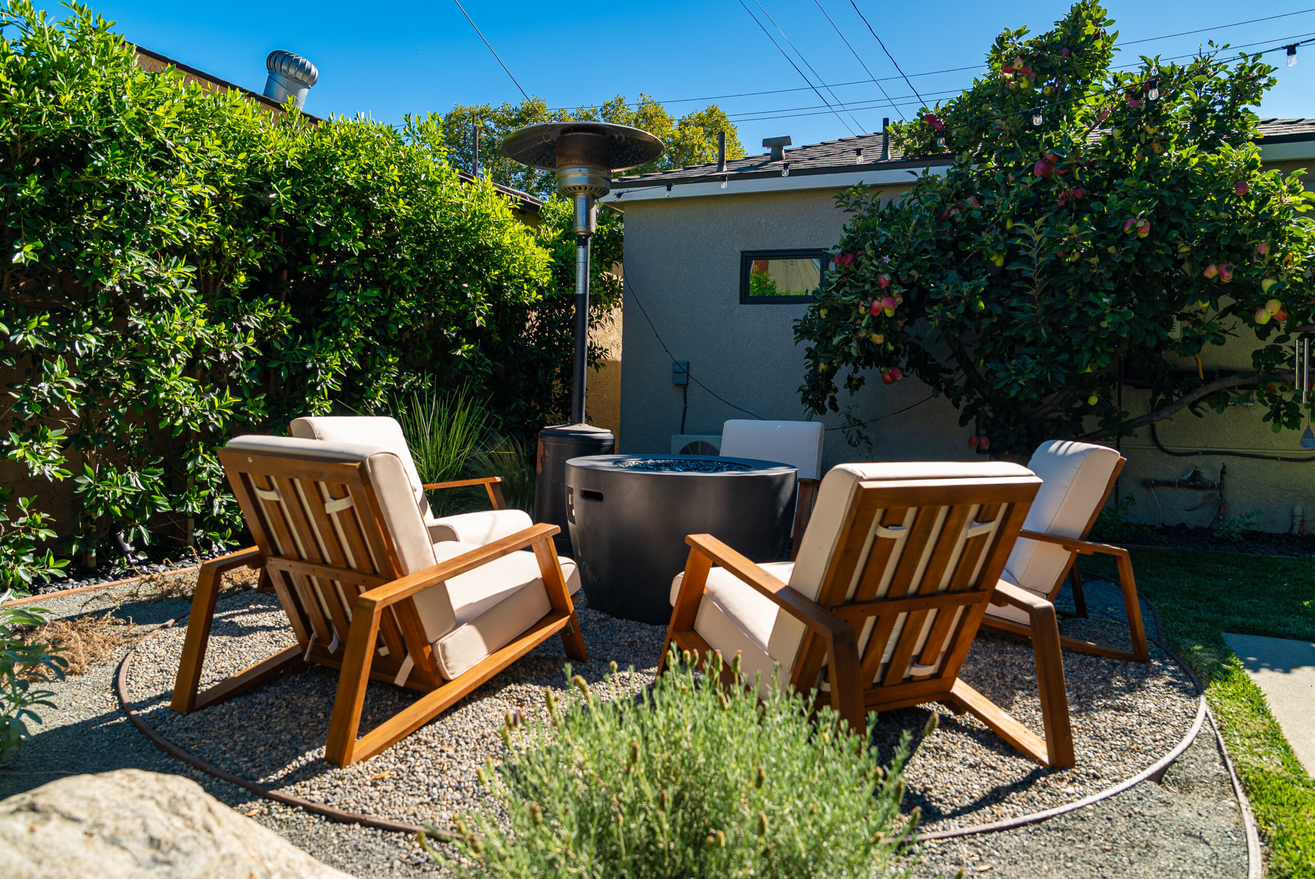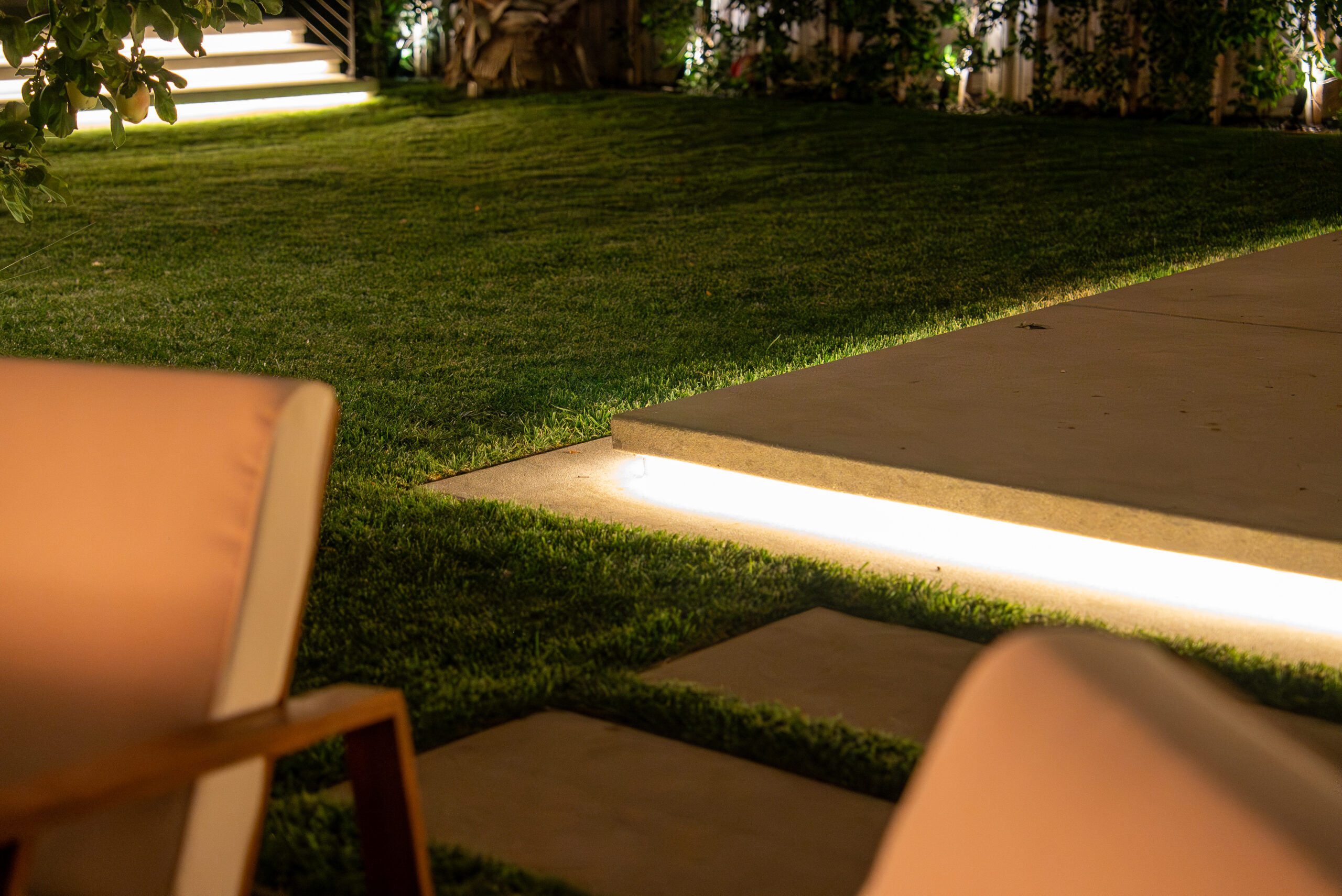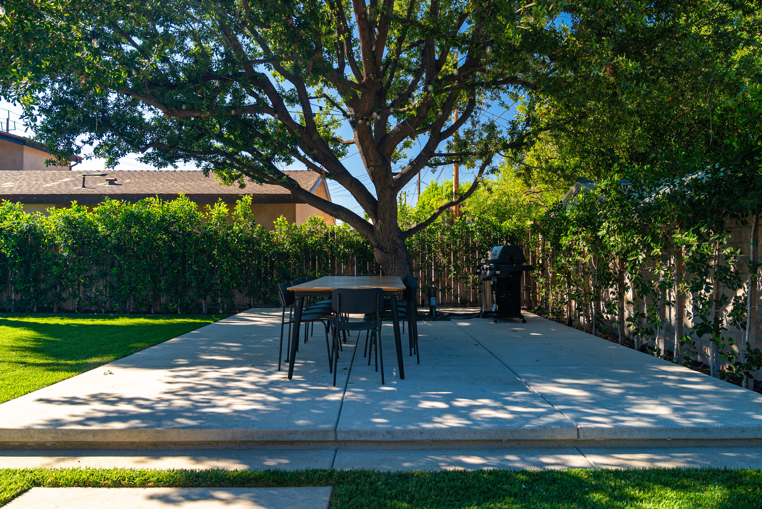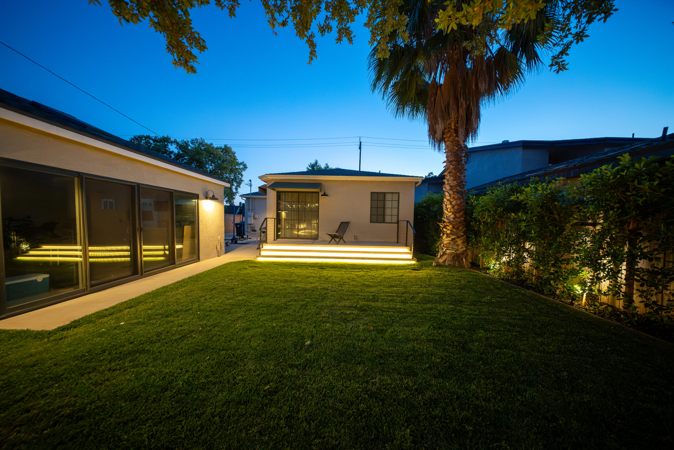 Designed for everyday use and entertaining, this backyard upgrade combines durable concrete features with warm, natural elements. Concrete steps and a spacious patio provide structure and flow, while new sod and surrounding landscaping add balance and comfort. The fire pit area serves as a focal point for gatherings, enhanced by outdoor lighting that creates ambiance and visibility after sunset.